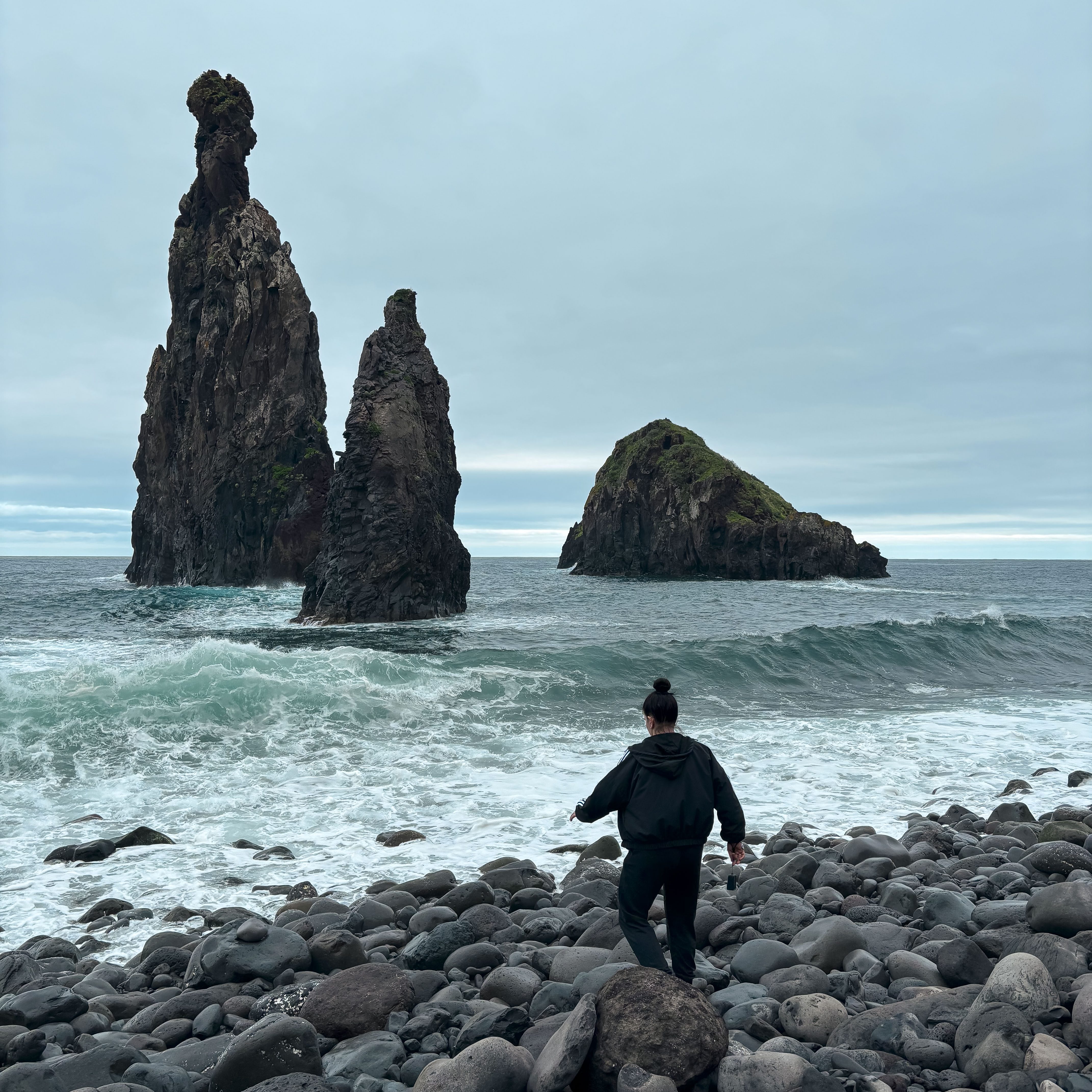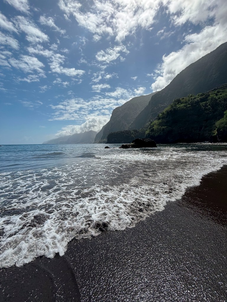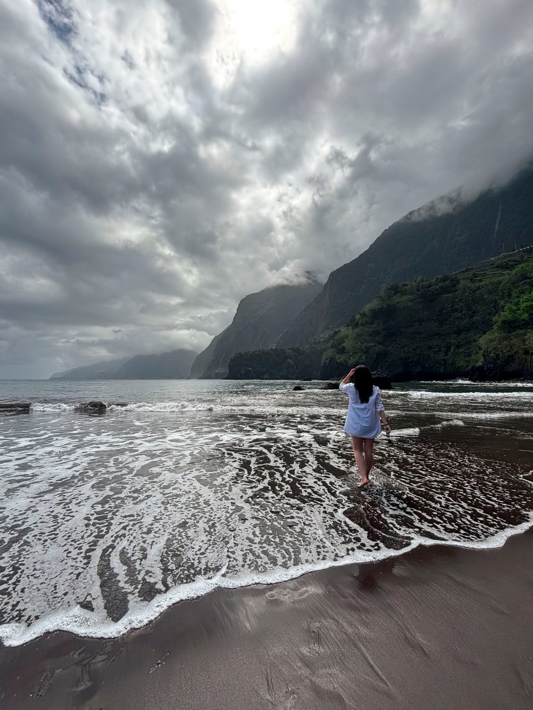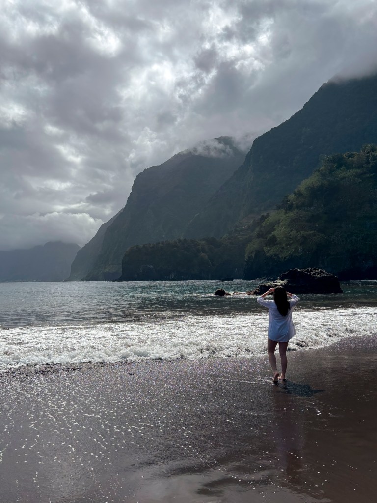 Po dvou náročných dnech bylo potřeba trochu zvolnit, takže jsme den začaly na pláži v městečku Seixal. Hlavním lákadlem je tady černý písek a hlavně je tahle pláž je totální pinterest photo spot. Díky tomu, že jsme dorazily hned ráno, stihly jsme minimum lidí a i trochu slunce, takže jsme se šly vykoupat do Atlantského oceánu.