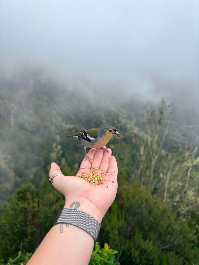 Asi hodinu cesty od São Vicente se nachází vyhlídka Miradouro dos Balcões (PR11). Parkovišť je tu víc, ale doporučuju přijet brzy. Tahle vyhlídka je známá tím, že kolem vás létají ptáčci, kteří se lidí vůbec nebojí. Pokud chcete, aby vám sedli na ruku, musíte mít krmení – prodává se v obchůdcích u začátku trasy (není vystavené, musíte se zeptat). Nás pytlík zobu stál 1 €.