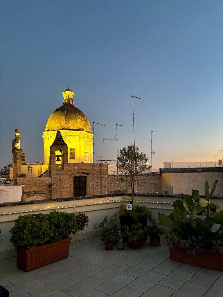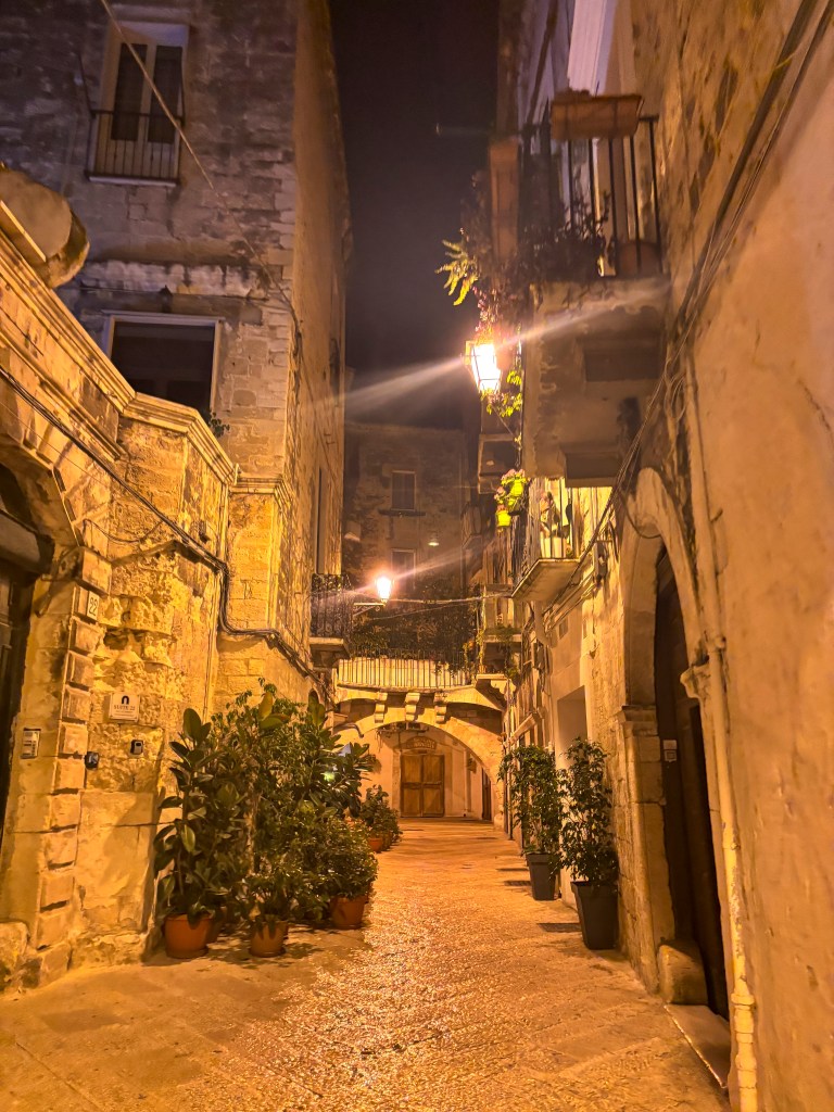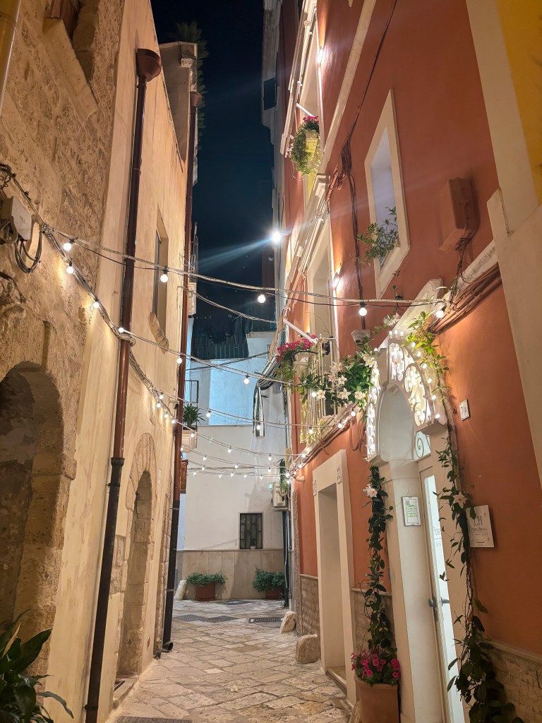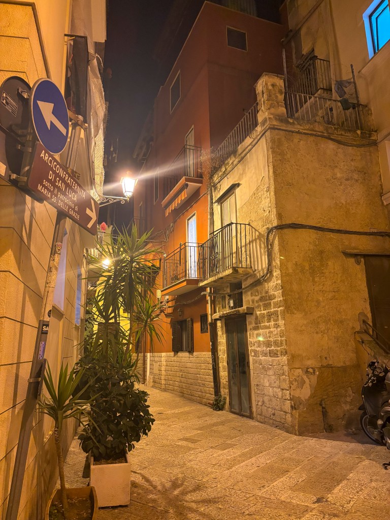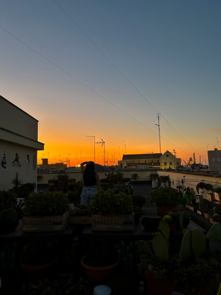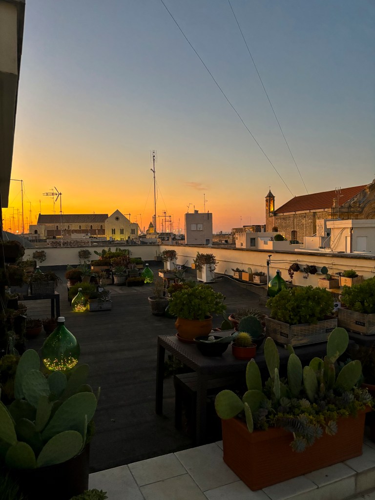 Přílet – ubytování – večeře. Po příletu kolem osmé večer jsme z letiště vzaly taxi rovnou do centra. K ubytování jsme dorazily malebnými, starými italskými uličkami. A náš výhled z ubytování? Ten byl ještě lepší! Ubytované jsme byly v Palazzo Verrone, které fungovalo na principu ubytovacích buněk se společnou kuchyní. Největší kouzlo ale měla střecha – plná kaktusů a dalších rostlin. Nabízela pohled na uličky Bari a večer byla celá rozzářená světýlky.