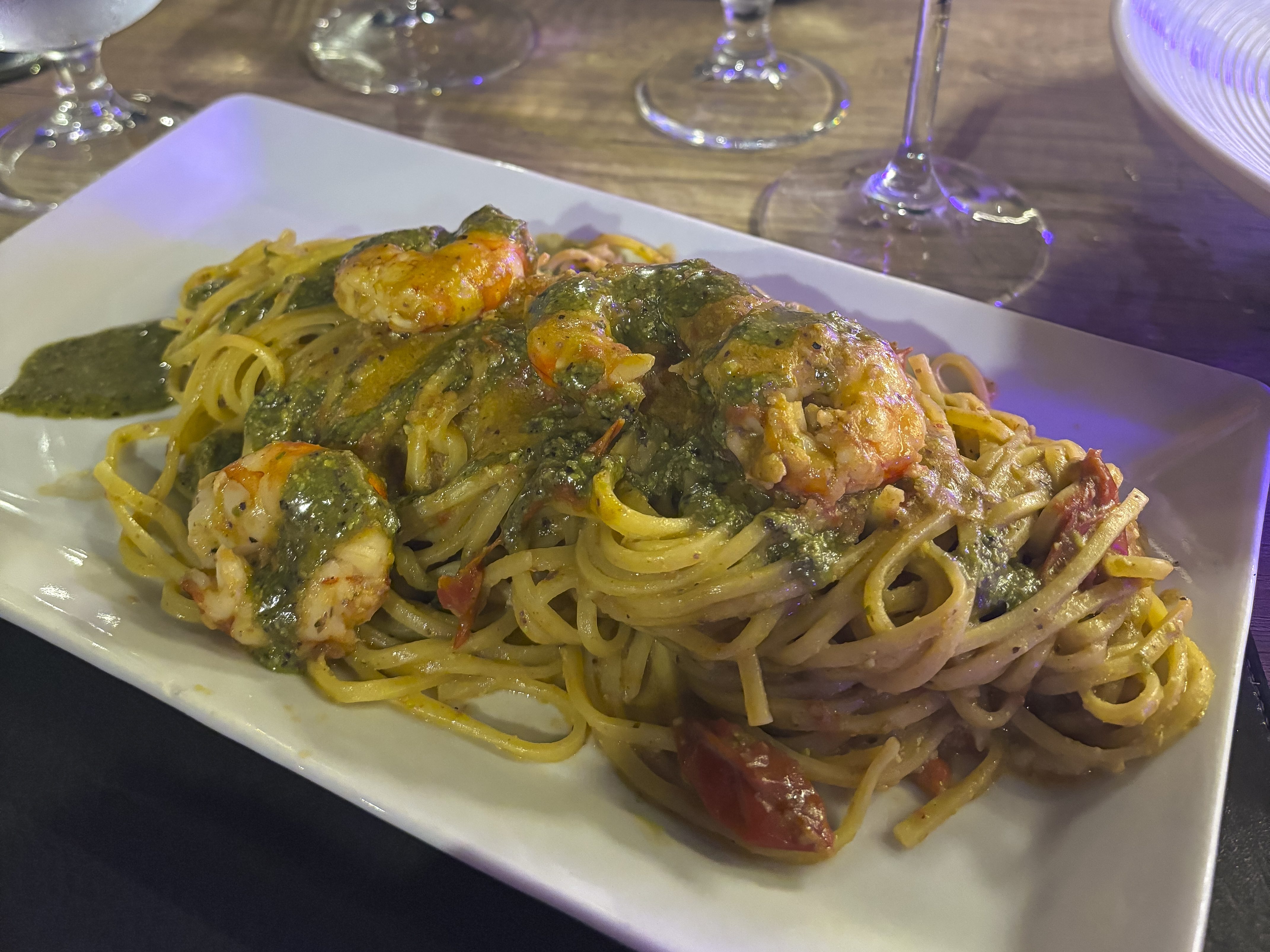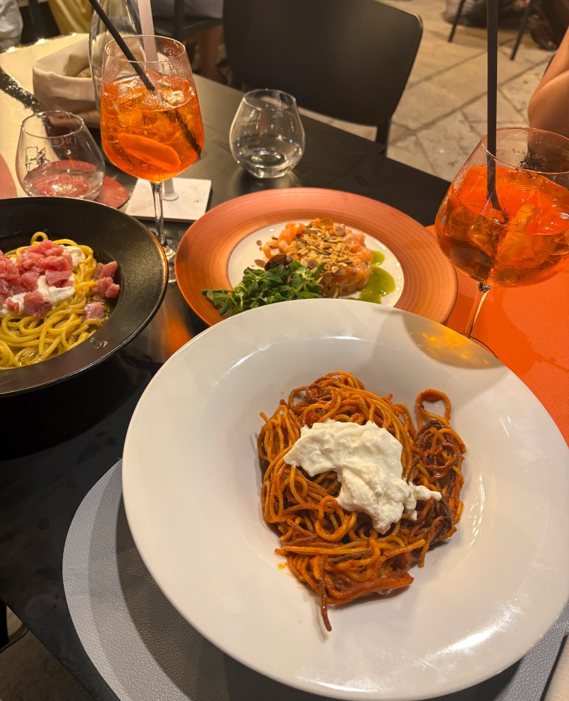 Večer nás čekala opět raketová večeře – špagety s krevetami v Sorsi e Morsi Food, Wine & Drink.