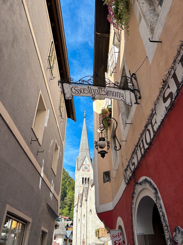 Město je plné obchůdků, stánků a barevných domečků. Naše cesta vedla kolem jezera, skrze místní uličky až po vyhlídku, kde jde vidět na centrum Hallstattu. Město se dá projít za hodinu.